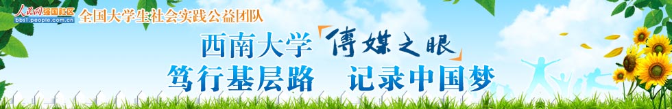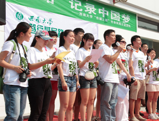 西南大學(xué)“傳媒之眼”社會實踐隊由新聞傳媒學(xué)院團(tuán)委老師李海峰、范曦帶隊,8名研究生、19名本科生組成。團(tuán)隊圍繞“篤行基層路,記錄中國夢”的主題,自7月3日開始,從建設(shè)生態(tài)北碚、“百姓中國夢”主題宣講、“幸福重慶”人文記錄、“山城百姓”社會調(diào)查四個方面開展活動。團(tuán)隊已經(jīng)在歇馬鎮(zhèn)碚青路中心廣場舉行了文藝匯演,并給群眾帶來了各種各樣的避暑藥品;到歇馬污水處理廠,了解當(dāng)?shù)厣a(chǎn)生活污水的處理;到重慶歇馬機械曲軸有限公司,宣傳“節(jié)能生產(chǎn)”理念,在員工中開展環(huán)保培訓(xùn),強調(diào)可持續(xù)生產(chǎn)和發(fā)展。