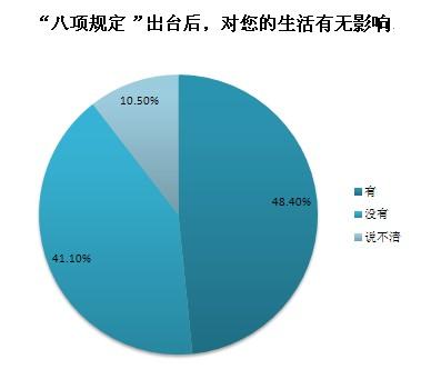 截至2013年12月20日10時,共收到網(wǎng)絡(luò)問卷2442份,48.4%的受訪者認(rèn)為“八項規(guī)定”對個人生活有影響,其中公務(wù)員群體認(rèn)為“八項規(guī)定”帶來的最大影響是“公務(wù)吃請少了,能抽出更多時間陪伴家人”和“津貼補(bǔ)貼獎金少了,勒緊褲帶過日子”,非公務(wù)員群體認(rèn)為“八項規(guī)定”帶來的最大影響是“酒店、高端會所門外的公務(wù)用車少了”和“遇到領(lǐng)導(dǎo)考察工作時,地毯鮮花迎送領(lǐng)導(dǎo)的情況少了”。