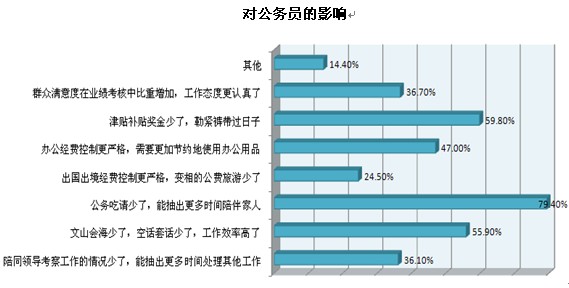 “八項規(guī)定”的執(zhí)行給公務(wù)員帶來的最大影響是什么?本次調(diào)查中,排名前三位的影響依次是“公務(wù)吃請少了,能抽出更多時間陪伴家人”(79.4%)、“津貼補(bǔ)貼獎金少了,勒緊褲帶過日子”(59.8%)和“文山會海少了,空話套話少了,工作效率高了”(55.9%)。