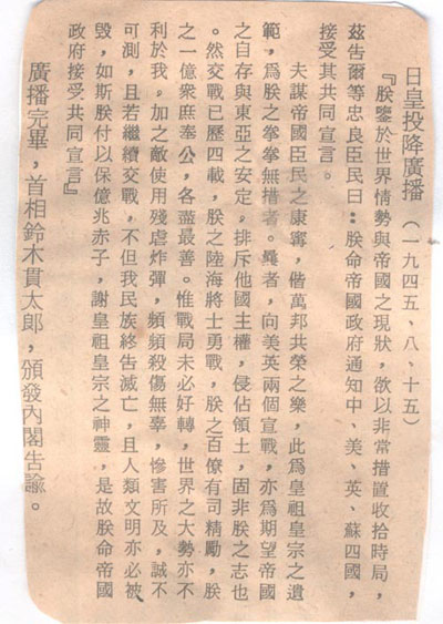 1945年8月15日日本天皇投降廣播詞。這篇文告是告訴自己的老百姓(忠良臣民)的。其中對(duì)于發(fā)動(dòng)戰(zhàn)爭(zhēng)的罪責(zé)不但沒(méi)有一個(gè)字的自責(zé),而且指“敵使用殘虐炸彈,頻頻殺傷無(wú)辜,慘害所及,誠(chéng)不可測(cè)!焙褪嗄旰笏l(fā)現(xiàn)的東條英機(jī)遺囑的惡劣態(tài)度如出一轍。廣大網(wǎng)友不放回頭看看2013年12月12日18:21:31《歷史鐵證日本400年侵華野心,讓我們恨搗靖國(guó)神社內(nèi)幕吧!》一文中東條英機(jī)的遺囑。