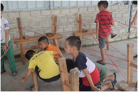 運動會圍繞“趣味”開展,把國學(xué)知識與當(dāng)?shù)貍鹘y(tǒng)文化融進游戲中,在充分考慮孩子們的興趣、體能的基礎(chǔ)上,志愿者們設(shè)計了寓教于樂、智體合一的活動項目?简灊h字書寫功底的“遨游天際”紙飛機放飛項目,考驗快速口算能力的“珠聯(lián)數(shù)合”,考察詩詞成語等基本文化素養(yǎng)的“三人游”、“趣味投壺”、“障礙賽”等比賽項目深受孩子們喜歡。“趣味投壺”比賽是根據(jù)古時雅士宴飲游戲結(jié)合當(dāng)?shù)毓乓鉂夂竦拇屣L(fēng)設(shè)計的,孩子們在壺前一改活潑好動的特點,凝神靜氣、不急不躁、耐心瞄準(zhǔn)壺口,頗有“君子無所爭,其爭也君子”的模樣。這個項目不僅鍛煉耐性,還讓孩子們親身體會了傳統(tǒng)文化的精髓,對謙讓有禮的傳統(tǒng)美德有了更深認識。