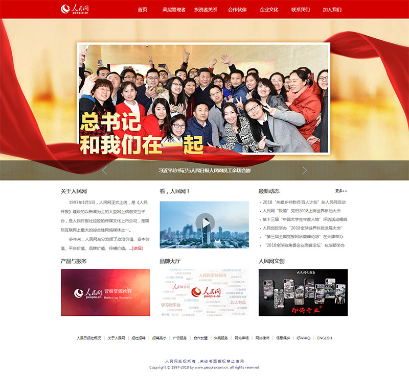 改版后,內(nèi)容呈現(xiàn)上既有人民網(wǎng)實力的全面展示,也突顯了上市公司的專業(yè)化形象。為了便于網(wǎng)友“零距離接觸”人民網(wǎng),頁面主展示區(qū)劃分成“關于人民網(wǎng)”“看,人民網(wǎng)!”“最新動態(tài)”“產(chǎn)品與服務”“品牌大廳”“人民網(wǎng)文創(chuàng)”六大塊區(qū)域,內(nèi)容重點突出,直觀醒目。