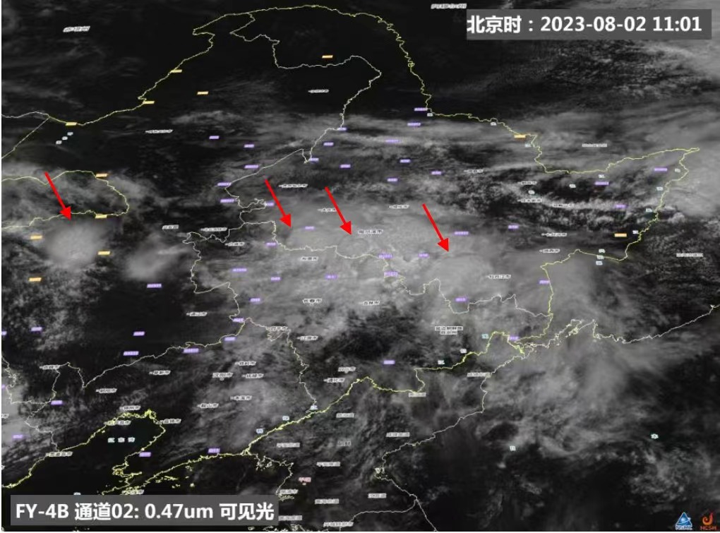 風云四號B星可見光圖像顯示,黑龍江南部、吉林省北部以及內(nèi)蒙古中東部局地的對流活動明顯,出現(xiàn)白亮的上沖云頂。圖片來源:國家衛(wèi)星氣象中心